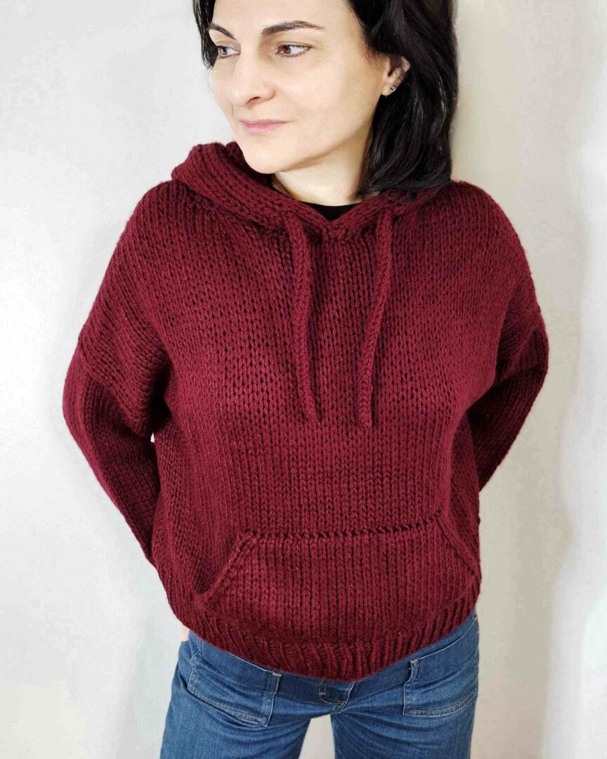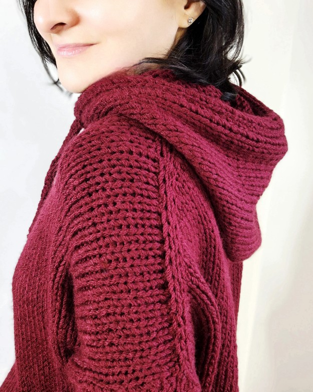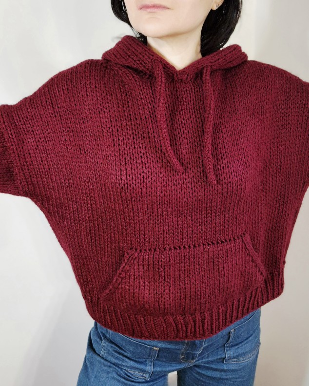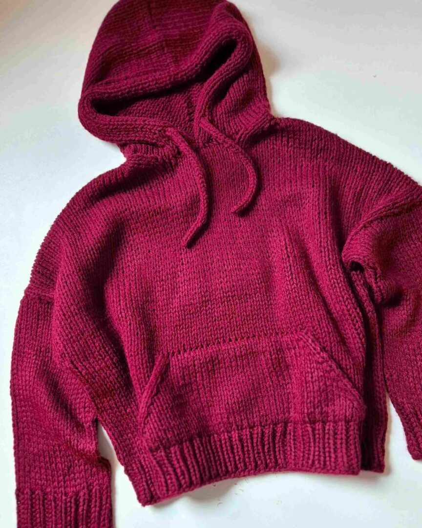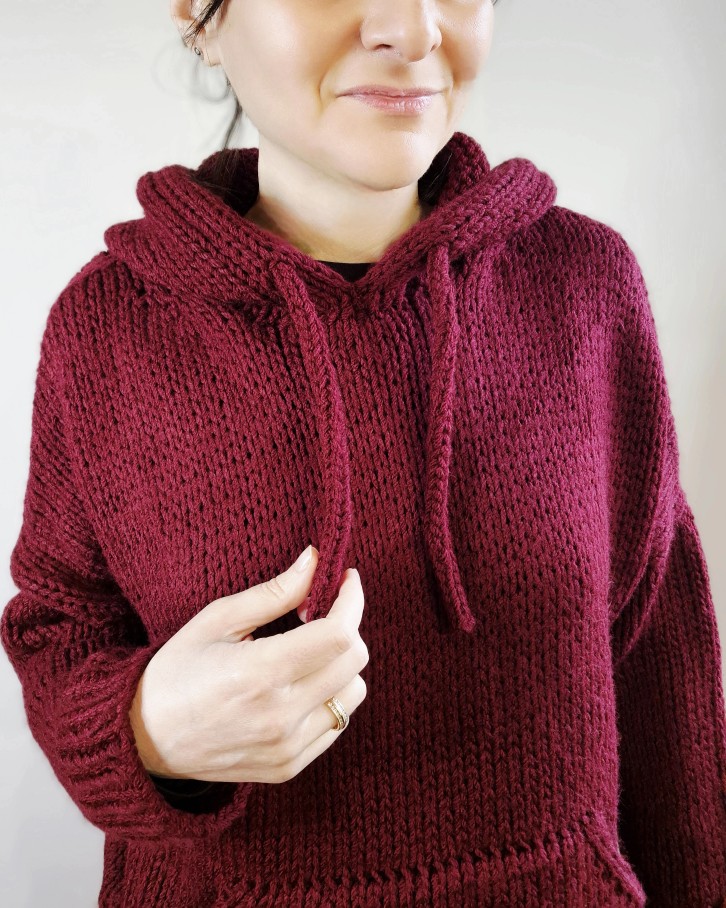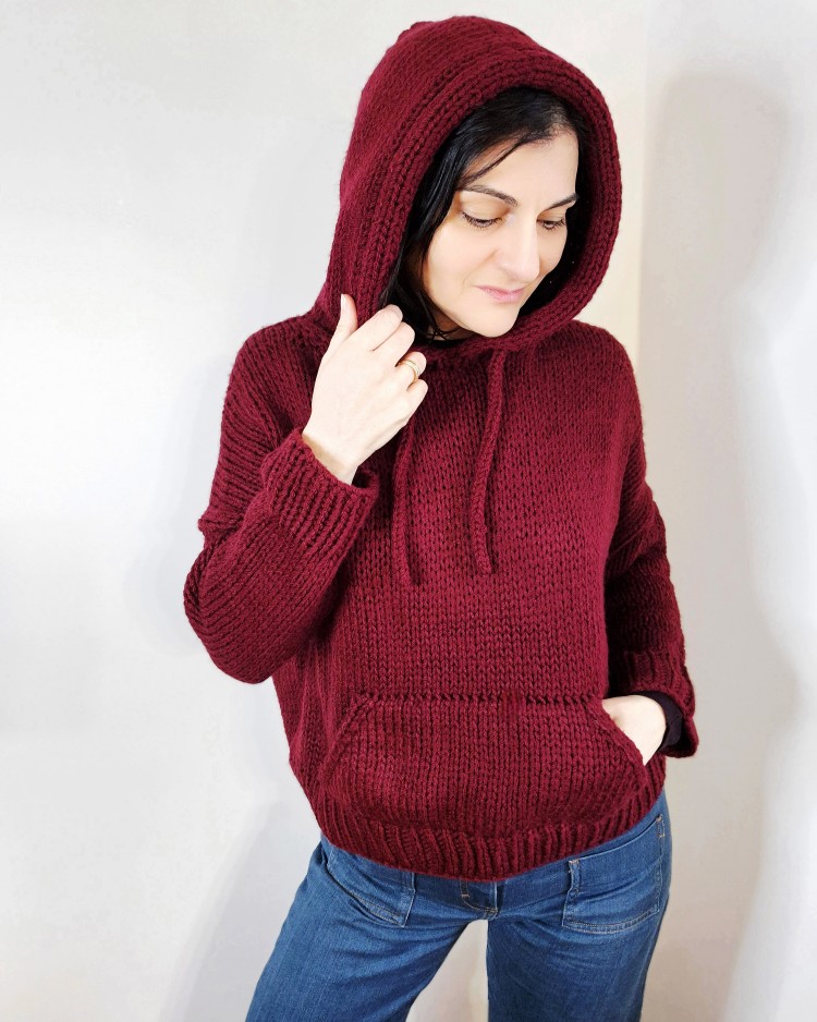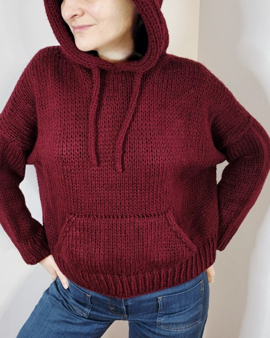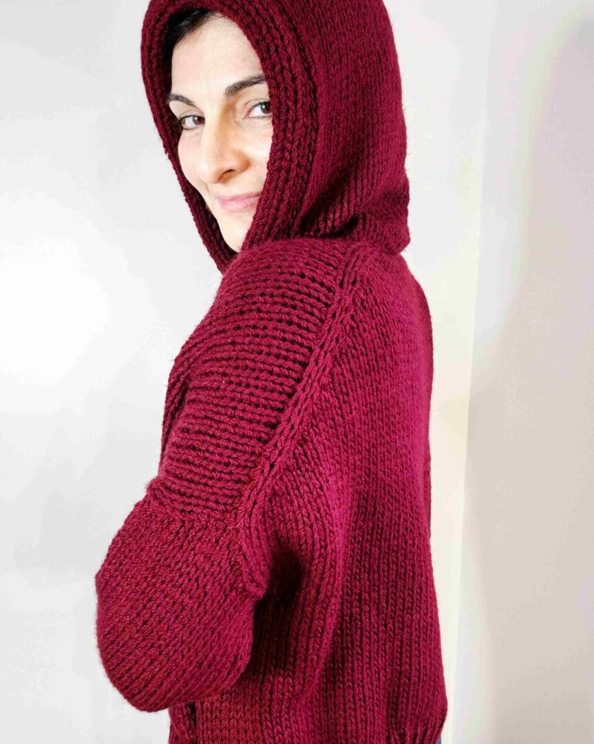 - Des aiguilles circulaires n°8 mm et n°6 mm (+ câble de 60 à 80 cm pour la capuche, la poche ventrale et les manches + câble de 80 à 100 cm pour le corps du pull) ;
